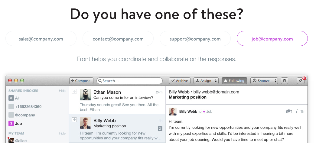 Front repose, souvent les bonnes idées, sur un fonctionnement simple, 1 boite de réception commune à toute une équipe qui va permettre de recevoir les mails, les interactions Twitter et bientôt gérer les comptes Facebook, Linkedin et Disqus.