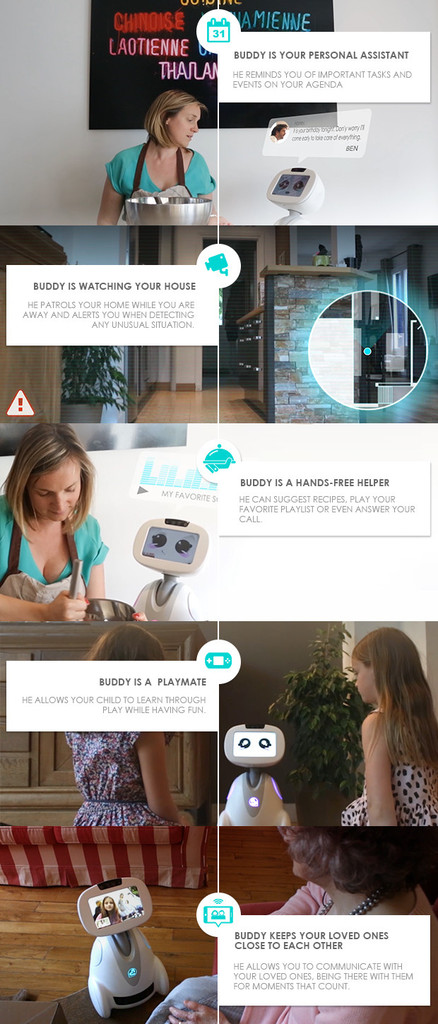 Buddy est un petit robot compagnon qui grâce à ses 3 roues peut se déplacer partout, monter la garde et faire des rondes, peut obéir à des ordres grâce à un système vocales, servir d'outil de visioconférence… La promesse des concepteurs en faire un robot qui peut apprendre et progresser pour en faire un vrai compagnon.