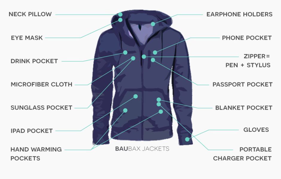La veste propose une série de 15 « fonctions » qui peuvent être considérées comme les must have du voyage. Pas très sexy mais pratique, elle cache un coussin, de quoi occulter la lumière, un emplacement pour mettre un iPad, des poches dédiés aux casques audio, au passeport, aux lunettes de soleil…